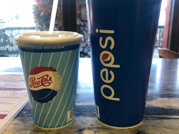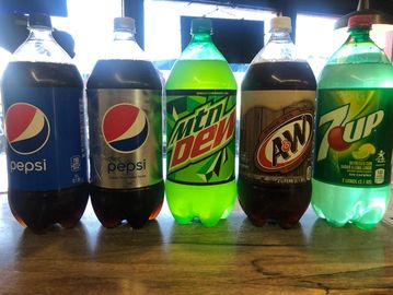 Pepsi, Diet Pepsi, Wild Cherry Pepsi, Root Beer, 7-up, Lemonade, Mountain Dew, Iced Tea, Dr Pepper.