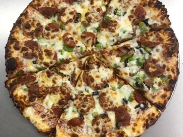 Pepperoni, Italian Sausage, Black Olives, Onions, Green Peppers, Mushrooms, Cheese.