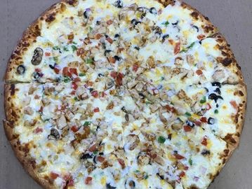 Chicken, Black Olives, Mushrooms, Green Peppers, Onion, Tomatoes, Garlic, Ranch Dressing, Cheese.